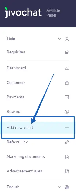 Please note that you can't add an existing customer using this button. If you want to add an client that already has an account on JivoChat, start a chat to talk to the affiliate program manager or send an email directly to paula@jivochat.com.
