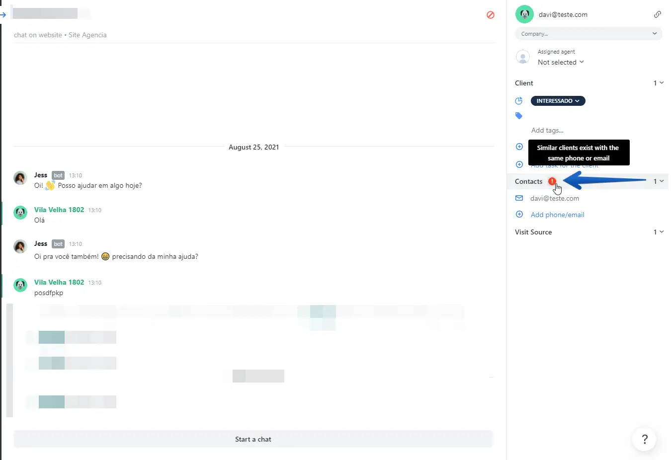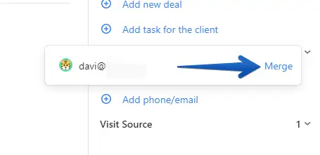If there is already a client into the CRM section with certain contact information (email or phone), then you receive new chats from the same client (for example, from another device) and he shares his personal data (email and/or phone), the application will determine the presence of duplicates in JivoChat and give you the opportunity to merge them.