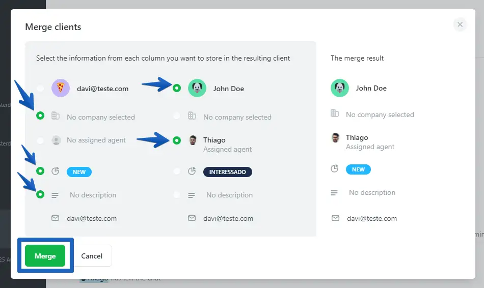 A window will open and you will need to choose which customer data will be filled in each chat. You must make a choice regarding the Name, Company, Responsible, Status, Category and Description fields. The rest of the data, like tags, tasks and deals, will be combined automatically.