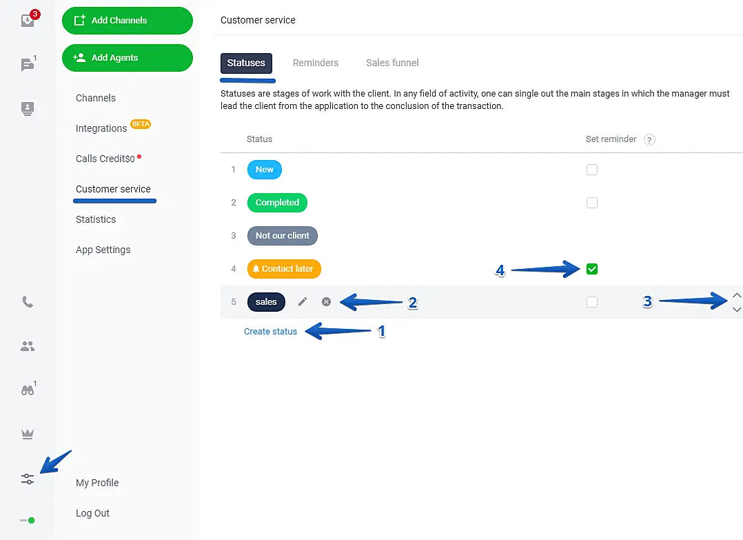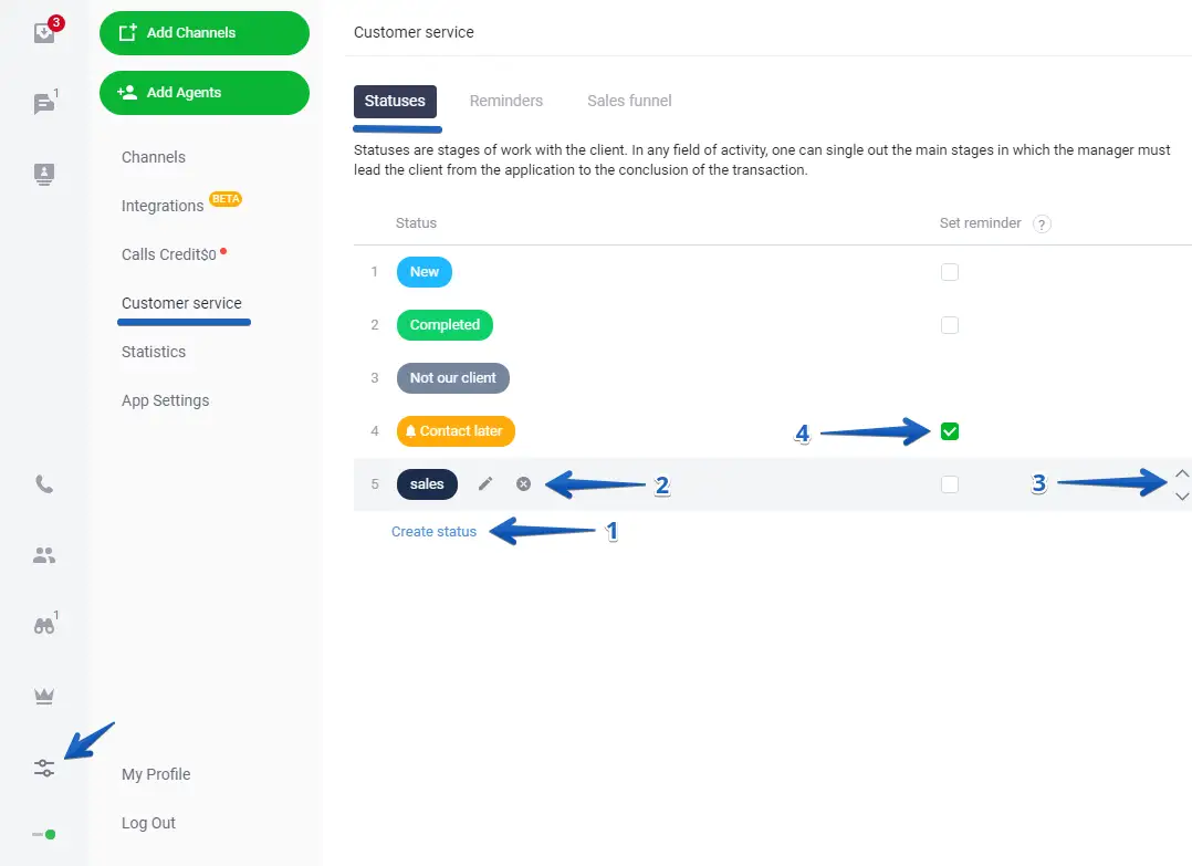 The setting "Statuses" is located in the section Manage -> Customer service, in the JivoChat app.