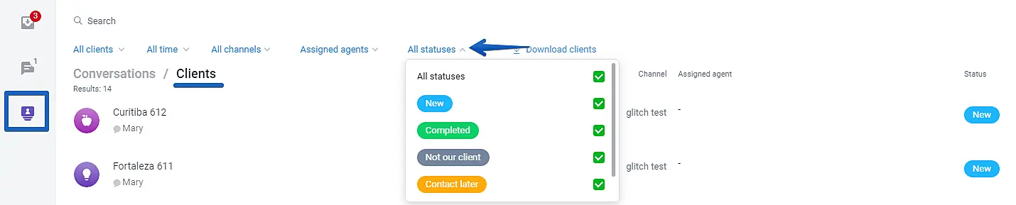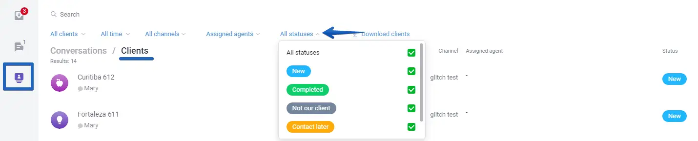 By using the Status feature, you can assign a specific label (tag) to a client and track at what stage of your workflow the client is, as well as conduct analytics on tags/statuses assigned to customers.