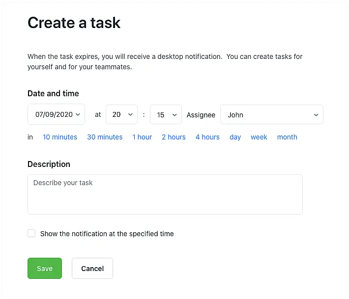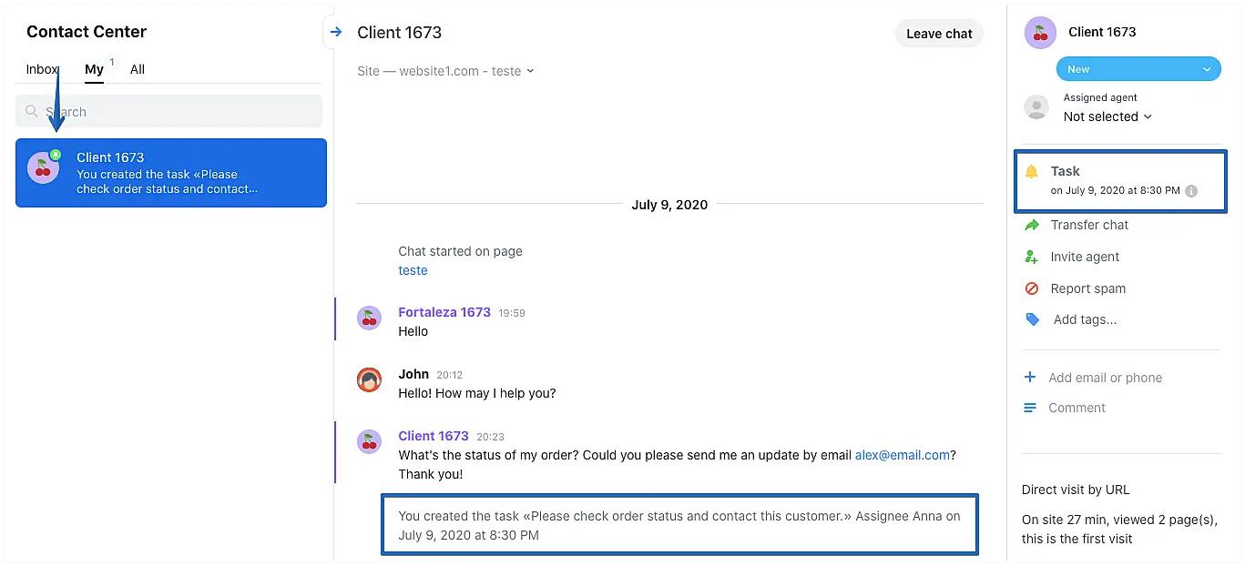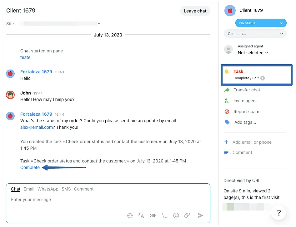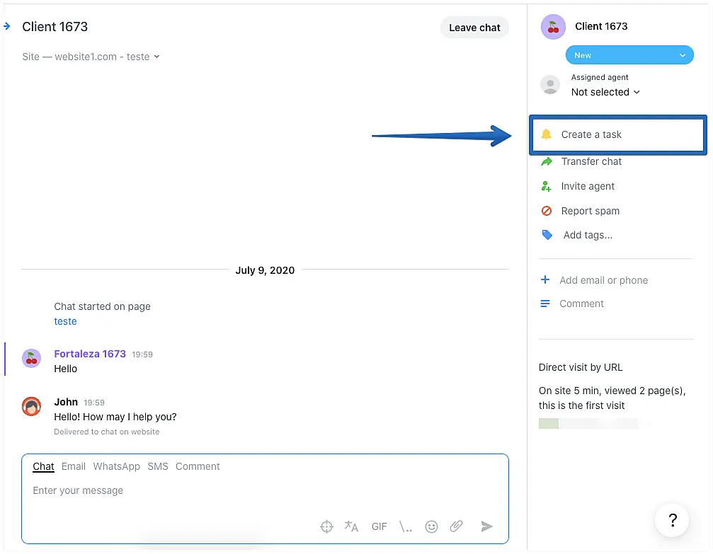 Some conversations may require a future action from an agent. You may need to confirm an information and later contact a client or give a client a call on an specific time and date. In such cases, you can set yourself or a teammate a task.
