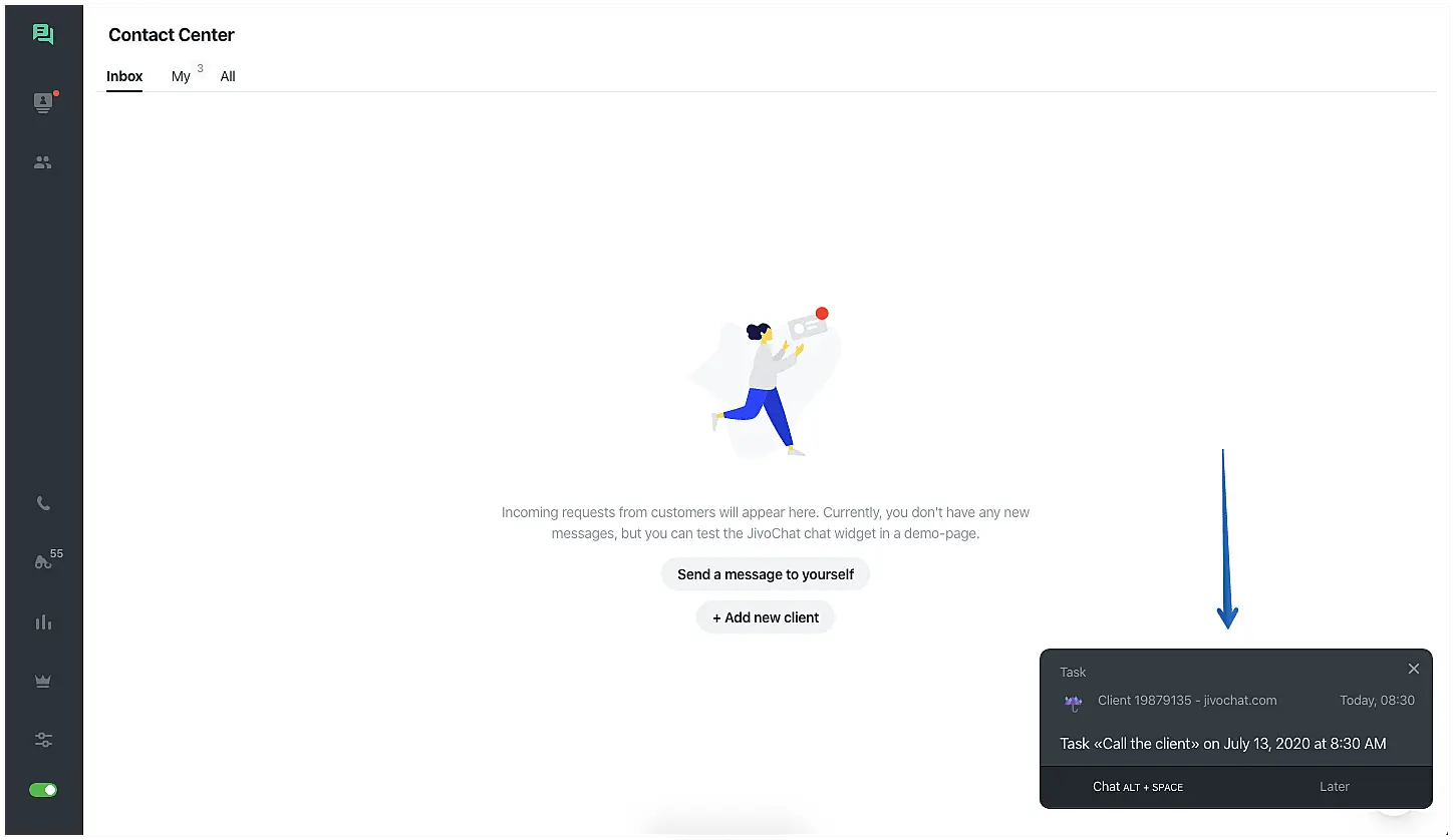 When time and date selected has come, the conversation with the task will automatically open on "Contact Center" > "My" section in the app for the agent.