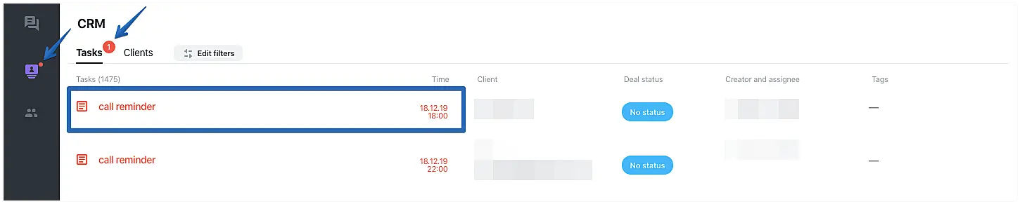 When a task is completed, its color will become light gray in the "CRM" > "Tasks" section and the bell icon will be removed from the client icon.