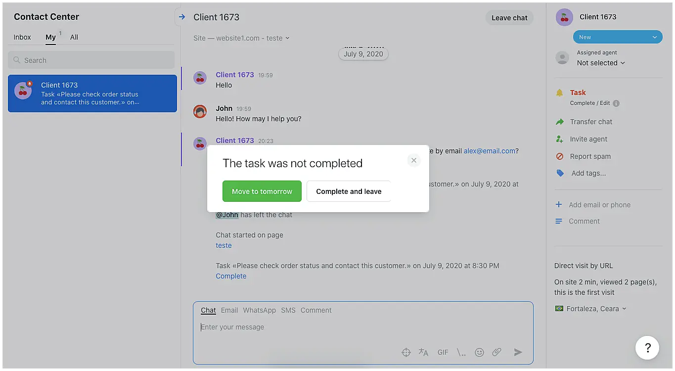 In case the agent tries to leave a chat with an incomplete task, he will be prompt to either "Move to tomorrow" or "Complete and leave".