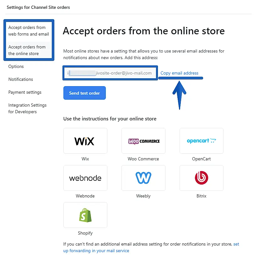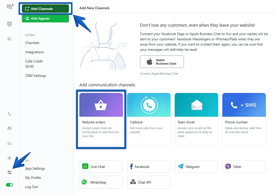 1. First of all, you'll need to generate your own unique JivoChat email address for receiving orders/emails from your website. To do that, access your JivoChat web application or one of our Desktop apps and go to "Manage" -> "Add Channels" -> "Website orders".