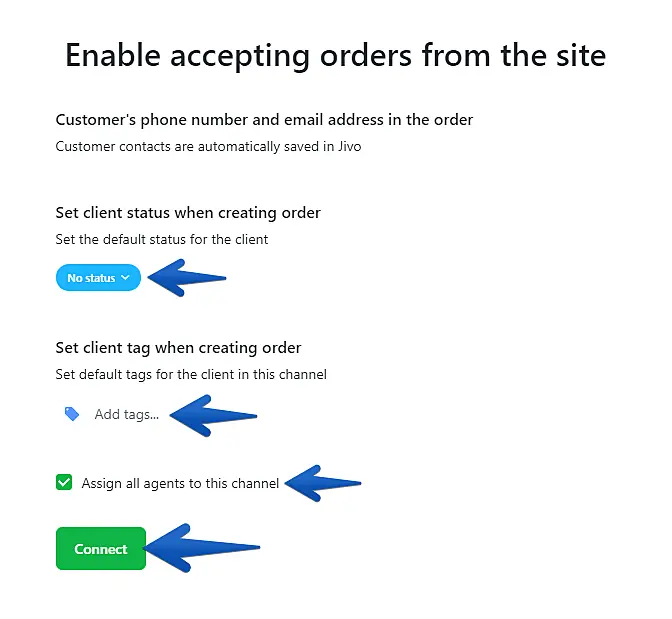 3. In this step, you'll be able to configure how you'd like your website orders/emails to reach JivoChat. You can configure a specific "Status" and also "Tags" to be automatically added to the incoming website orders/emails, and also assign which agents will be assigned to receive the incoming orders/emails in their JivoChat app. After setting up the channel, click to "Connect".