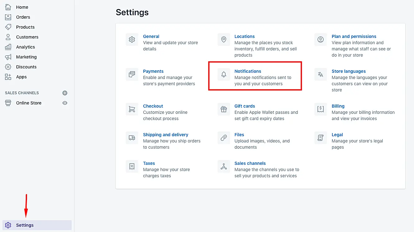 5. In your Shopify control panel, go to "Settings" -> "Notifications".