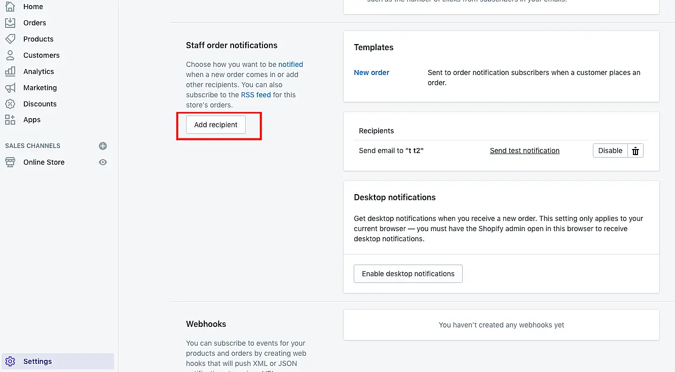 6. Look for the "Staff order notifications" section and click "Add recipient".