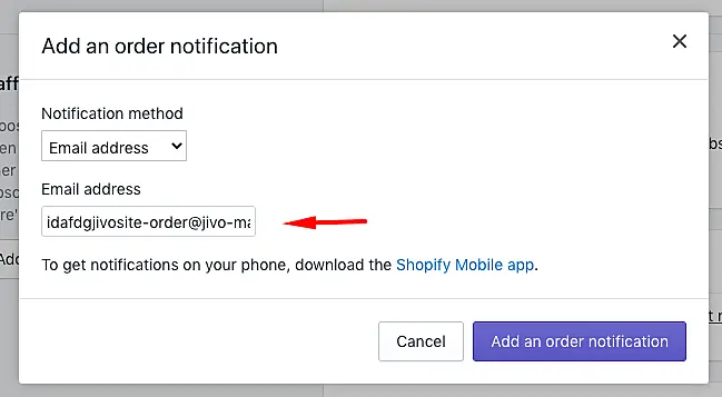 7. Enter your JivoChat order processing email in the "Email address" field in the opened popup.