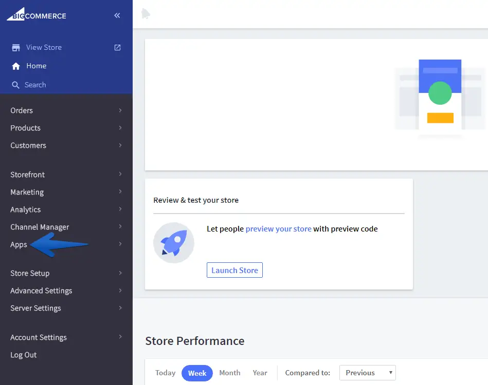 To install JivoChat on your BigCommerce website, please access your website panel and click on the "Apps" menu.