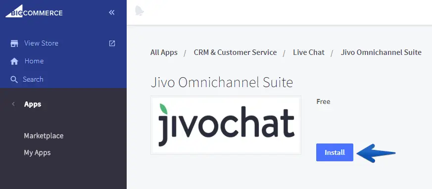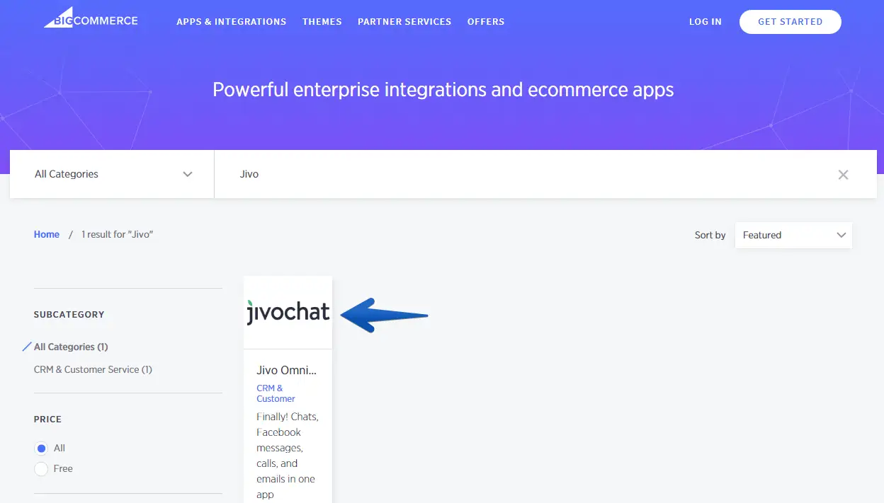 Search for JivoChat and click to enter the official JivoChat app page on BigCommerce.