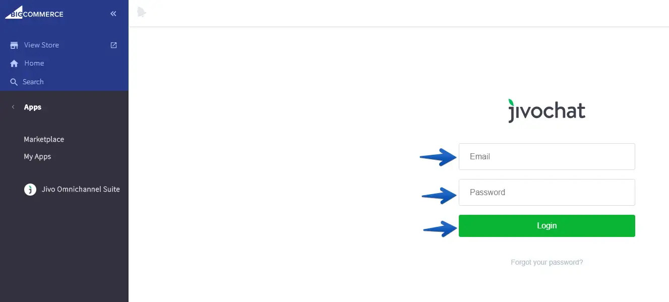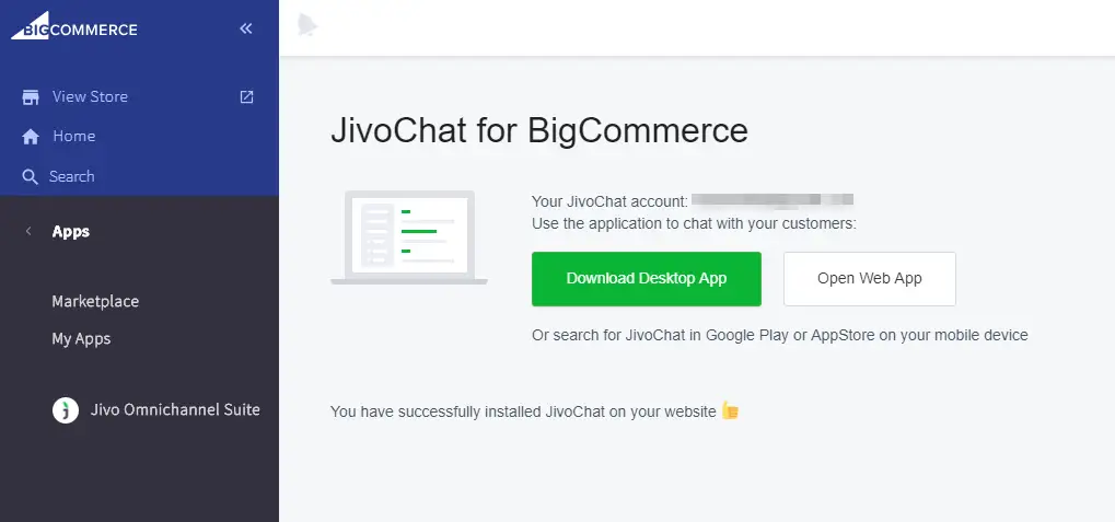 To be online and start receiving messages from your visitors, please login on one of the JivoChat agent apps. You can also click to download or access one of our apps from the image below which will appear to you on your BigCommerce website panel.