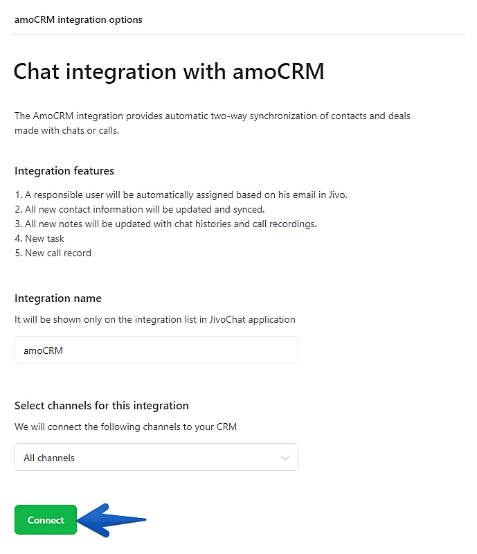 Insert a name for the integration or use the pre-defined one. Then, select which channels will be integrated with your amoCRM account and click "Connect".