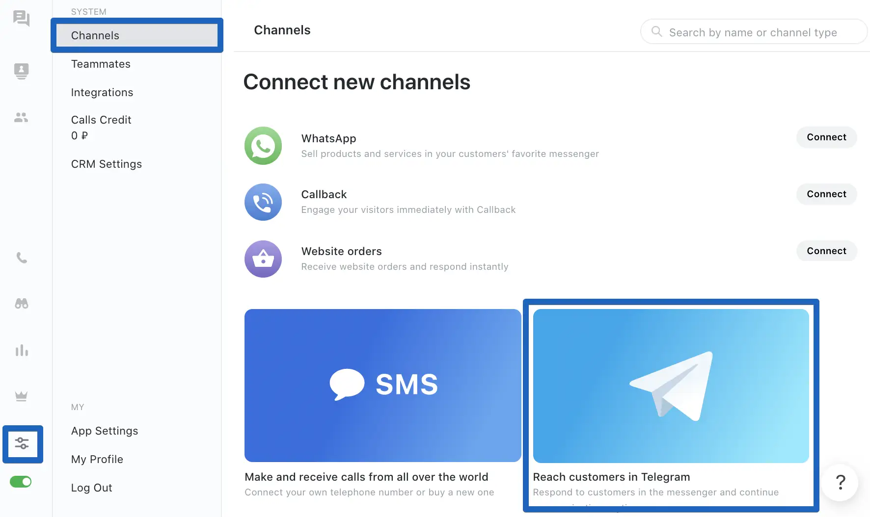 You will receive an HTTP API key. Copy it and go to your JivoChat web app or our Desktop app, go to "Manage" -> "Channels", find "Telegram" and click "Connect".