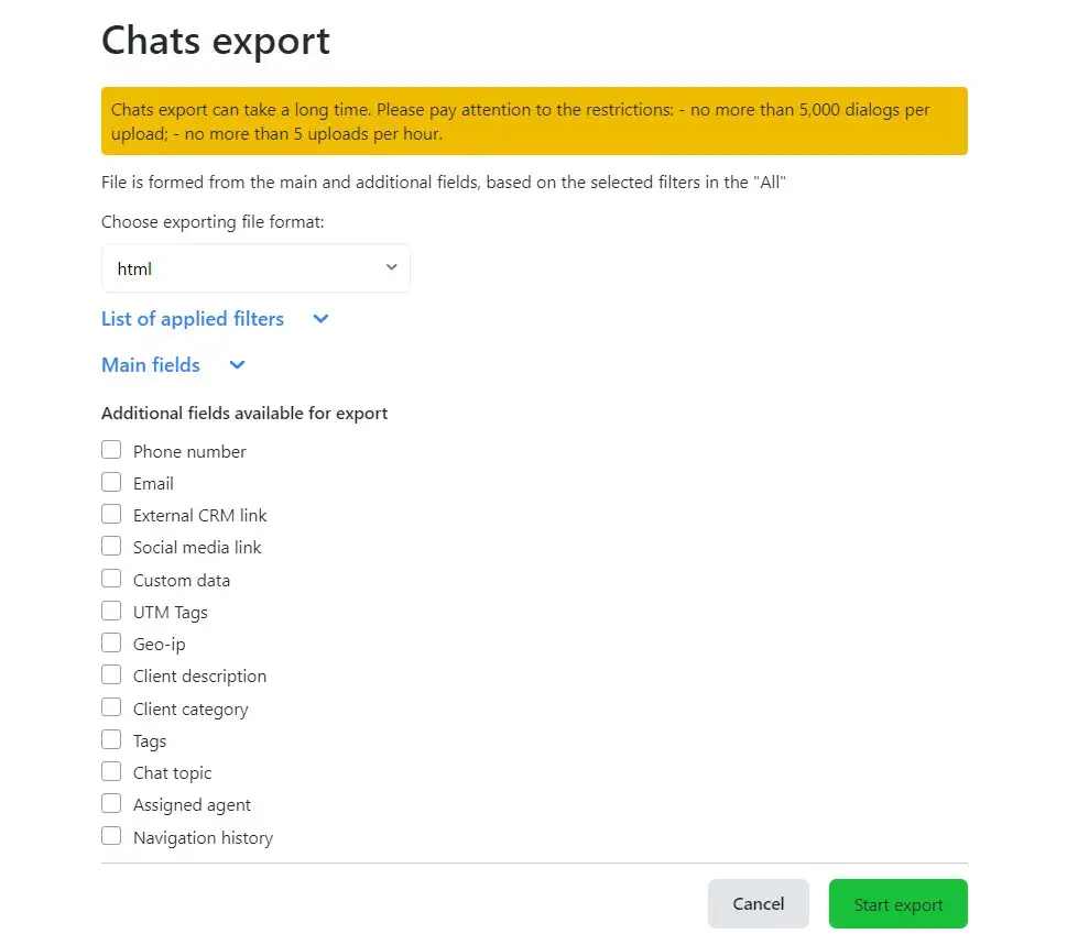- fields that you want to see in file with chats (the main fields are available by default [client ID, client name, communication channel, link to the client, number of requests, start date of the chat, response speed, duration of the chat, rating, comment on the rating, link to the dialog], you can also select additional fields)
