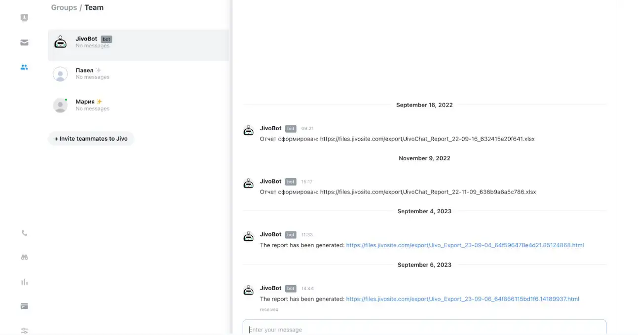 The formation of the file takes time, the file will be available in the "Team" section in the chat with JivoBot (just wait for notification)