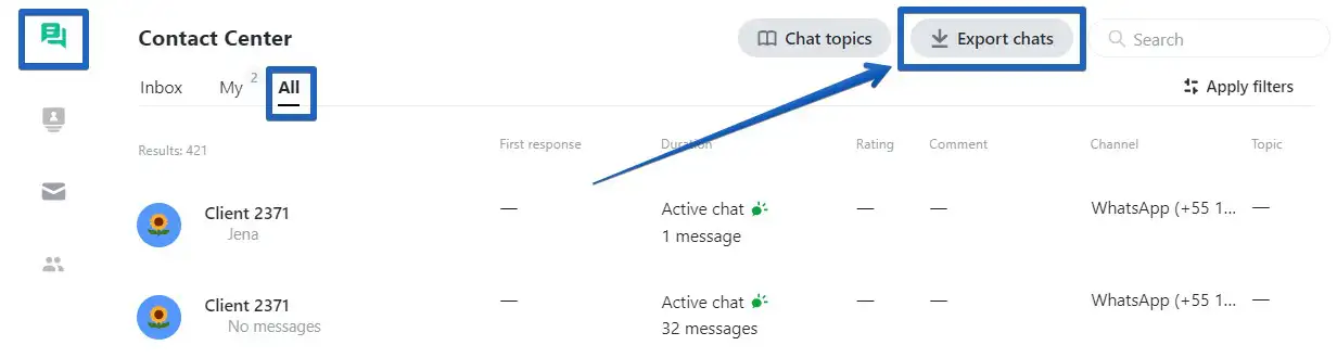 Go to the "All" tab in the Contact Center section and, if necessary, filter out the chats that you want to export.