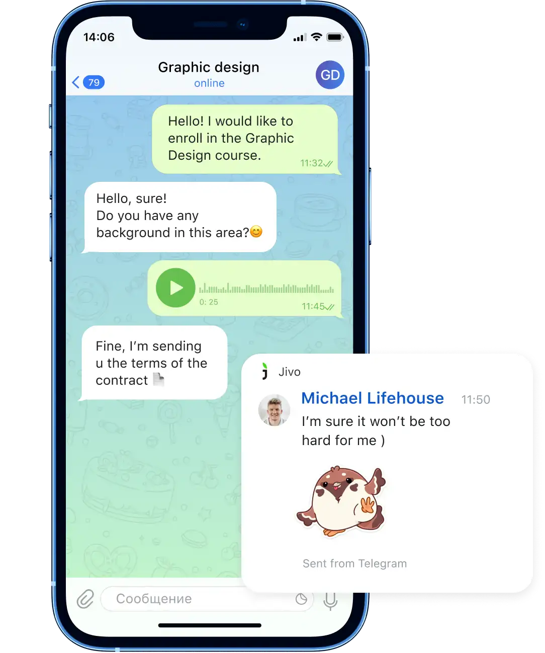 Connect Telegram to JivoChat and respond to the messenger requests through the JivoChat app: the client will not have to